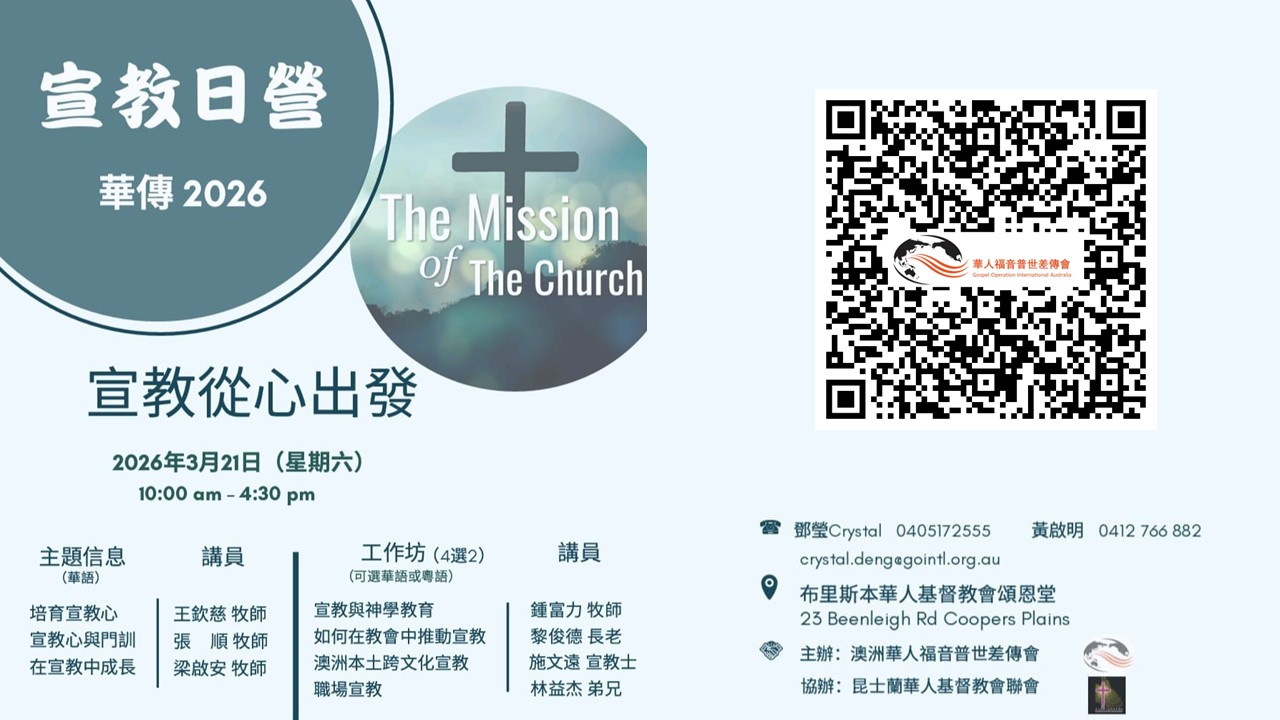《福音八講》第二講:奇異恩典:人類的盼望。將於4月12日 (周日) 在Rochedale 社區 Functio […]